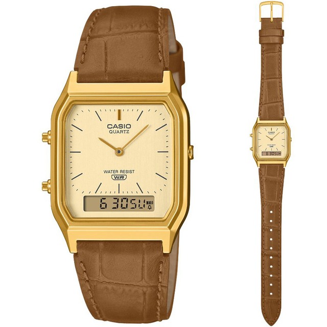 2025/10/17発売の商品です。 最近人気のスクエアフェイスから待望の革バンド追加です! ヴィンテージな装いのアナログ・デジタルコンビネーションモデルです。<br> ベースモデルは角型フェイスにアナログ時計とデジタル表示を組み合わせた人気のAQ-230。日常生活用防水やストップウオッチ、アラーム等、便利な機能も備えています。<br> ゴールドケースにブラウンレザーバンドを組み合わせ、クラシカルでエレガントな印象を与え温かみのある上品なスタイルを楽しめます。バンドにクラシカルな型押しデザインが施されており、細部にまでこだわった高級感を感じさせます。<br><br> 【店長の眼】 AQ-230というこのモデル、待望の革バンドが新製品として登場。革バンドにすることで急に高級感と共に郷愁感があふれます。古着ミックスに一点アンティーク主義なんて感じもアリでは?いざとなればフォーマルにも使える、一石二鳥♪ ユニセックスとしておりますが女性には少し大きめかなとも思います、ニットやスウェットなど長袖ものの上につけるならありでしょう。 【機能】 ●日常生活用防水 ●デュアルタイム ●ストップウオッチ(1/10秒、60分計) ●ケース・ベゼル材質:樹脂 ●バンド材質:本革バンド ●バンド装着可能サイズ:145〜210mm ●時刻アラーム・時報 ●オートカレンダー ●12/24時間制表示切替 ●電池寿命約3年 ●サイズ(H×W×D)/質量:38.8 × 29.8 × 8.1 mm/20g 付属 取り扱い説明書(保証書付)No.5154 ★こちらの商品は追跡可能メール便での出荷となります。