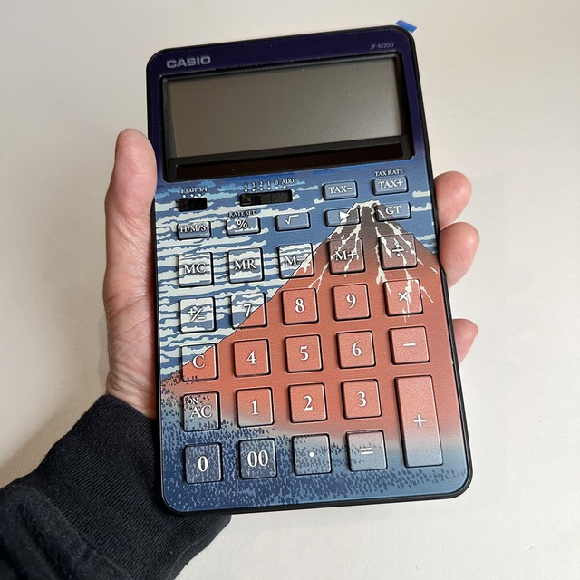 葛飾北斎の代表作「富嶽三十六景」全46図中から「凱風快晴」を全面にデザインしたスタイリッシュ電卓。「赤富士」とも呼ばれる。「凱風」は南風の意。夏から初秋にかけて、快晴のもとで赤く染まる富士山を捉えている。富士山の神聖さと日本の美意識を象徴。 そこにあるだけで、空間やインテリアの一部になるほどの存在感。スタイリッシュなフォルムが、使う人のセンスを静かに引き立てます。優れた操作性と視認性のジャストタイプです。ひと味違うモノを持ちたい貴方へ。 【店長の眼】 全面に印刷された葛飾北斎のARTを電卓で持ち歩けるなんて!?w まさか、ですよね。商談の時にさり気なくPCの横に置いてみたい 【機能】 ●製品特長 時間計算機能 税計算(税額計算や税率の変更可能) 傾斜表示(内部の液晶画面と製品本体の傾斜による) エコマーク商品(06135002) ●桁数 12桁 ●液晶ディスプレイ 計算状態表示 3桁位取り表示 ●キーの特徴 プラスチックキー フラットキー ●キーの機能 早打ち機能(2キーロールオーバー) ツーゼロ(00) 桁下げ(バックスペース:►) サインチェンジ(符号切替) ●メモリー メモリー数 2 独立メモリー(M+、M-、MR、MCキー方式) 総合計(グランドトータル計算) ●電源 T・W・P(ソーラー・電池の2電源) 電池 CR2025 × 1 電池寿命 約7年(1日1時間使用時) オートパワーオフ ●サイズ(奥行 × 幅 × 高さ):182 × 109 × 20.4 mm ●質量:193 g ●表示形式の設定 小数点セレクター(4/3/2/1/0/ADD2) ラウンドセレクター(表示桁数内での小数表示/切り捨て/四捨五入) ●基本計算 四則計算、四則定数計算、マルチパーセント計算、平方根(ルート)、概数計算 付属 取り扱い説明書(保証書付) ★こちらの商品は追跡可能メール便での出荷となります。