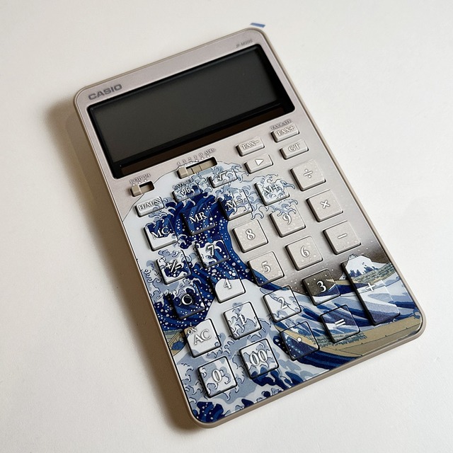 出荷予定日:4/6~10(早まる可能性もございます) 葛飾北斎の代表作「富嶽三十六景」全46図中から「神奈川沖浪裏」を全面にデザインしたスタイリッシュ電卓。激しい波間に木製の押送船が描かれ、自然の脅威に立ち向かう人々を描写。小さな富士山との対比で、動と静、大と小を見事に表現している。 そこにあるだけで、空間やインテリアの一部になるほどの存在感。スタイリッシュなフォルムが、使う人のセンスを静かに引き立てます。優れた操作性と視認性のジャストタイプです。ひと味違うモノを持ちたい貴方へ。 【店長の眼】 全面に印刷された葛飾北斎のARTを電卓で持ち歩けるなんて!?w まさか、ですよね。商談の時にさり気なくPCの横に置いてみたい 【機能】 ●製品特長 時間計算機能 税計算(税額計算や税率の変更可能) 傾斜表示(内部の液晶画面と製品本体の傾斜による) エコマーク商品(06135002) ●桁数 12桁 ●液晶ディスプレイ 計算状態表示 3桁位取り表示 ●キーの特徴 プラスチックキー フラットキー ●キーの機能 早打ち機能(2キーロールオーバー) ツーゼロ(00) 桁下げ(バックスペース:►) サインチェンジ(符号切替) ●メモリー メモリー数 2 独立メモリー(M+、M-、MR、MCキー方式) 総合計(グランドトータル計算) ●電源 T・W・P(ソーラー・電池の2電源) 電池 CR2025 × 1 電池寿命 約7年(1日1時間使用時) オートパワーオフ ●サイズ(奥行 × 幅 × 高さ):182 × 109 × 20.4 mm ●質量:193 g ●表示形式の設定 小数点セレクター(4/3/2/1/0/ADD2) ラウンドセレクター(表示桁数内での小数表示/切り捨て/四捨五入) ●基本計算 四則計算、四則定数計算、マルチパーセント計算、平方根(ルート)、概数計算 付属 取り扱い説明書(保証書付) ★こちらの商品は追跡可能メール便での出荷となります。