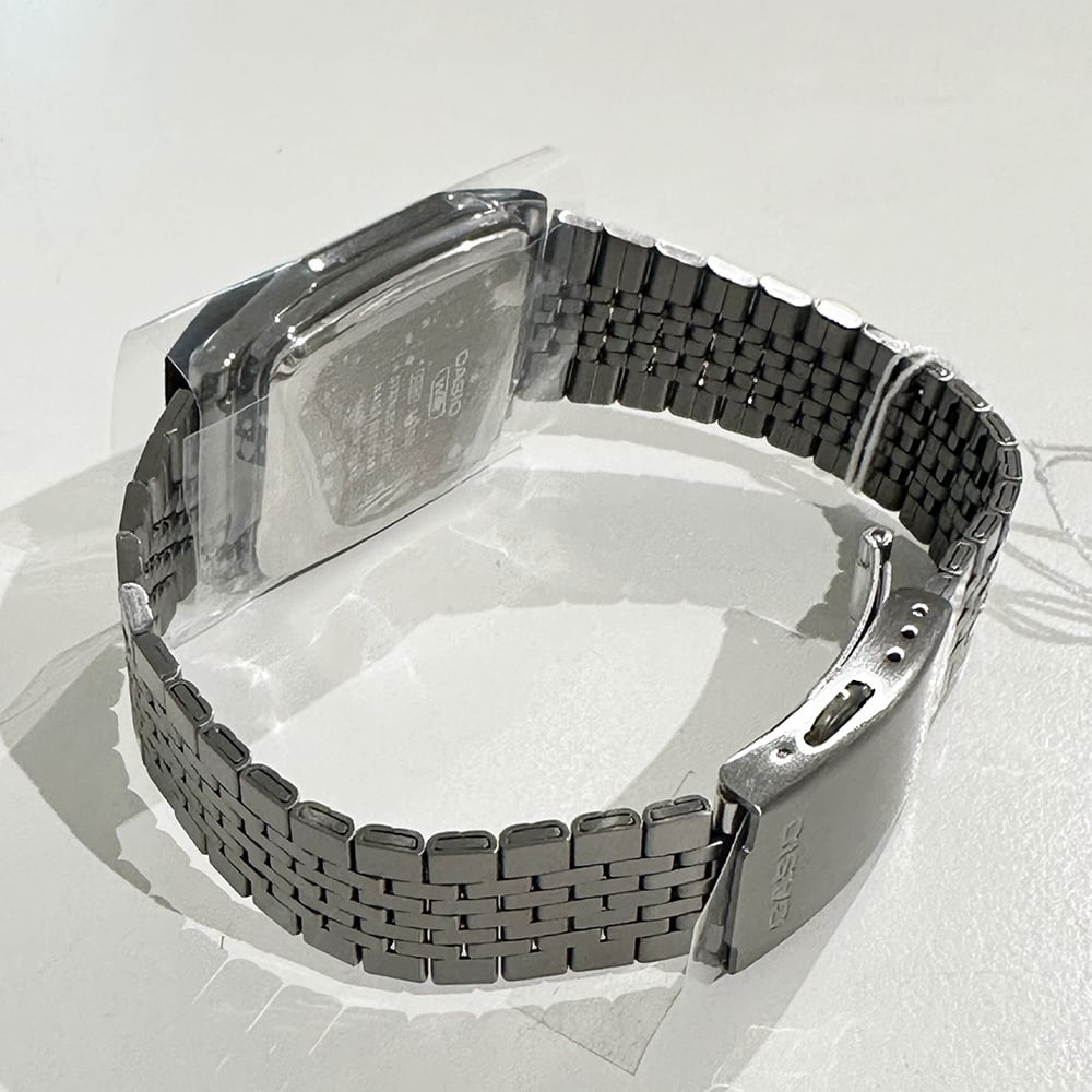 フルメタルタイプのPREMIUMシリーズA1100から、ワンカラーで纏めたミニマルデザインのモデルです。 ベースモデルは、1970年代後半に発売された52QS-14Bを復刻したA1100。ミラー効果のあるダイアルを採用し、フラットなケース・バンドデザインの中に煌めきを追加しています。 ヘアラインとミラーで丁寧に磨き分けされたケース、メタル素材のアイコニックなフロントボタンが上質な仕上がりに。さりげなく刻まれた機能表示も、質感を高めるポイントです。また、表面をフラットに仕上げた多列タイプのバンドを採用し、レトロなデザインと腕への着け心地を両立しています。 タイムレスなデザインとソリッドなメタルの質感が、腕元を華やかにするモデルです。