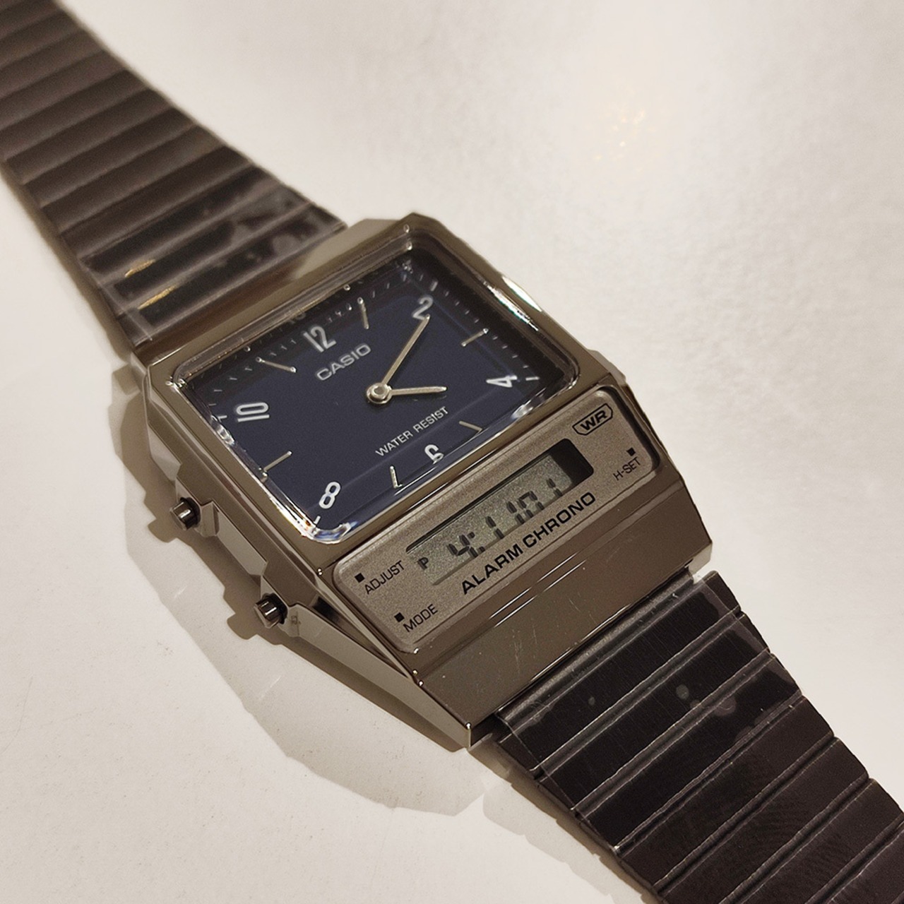 レトロアナデジ CASIO CLASSIC AQ-800EB-2AJF グレーIPバンド✕ネイビー文字盤 復刻 STANDARD Series