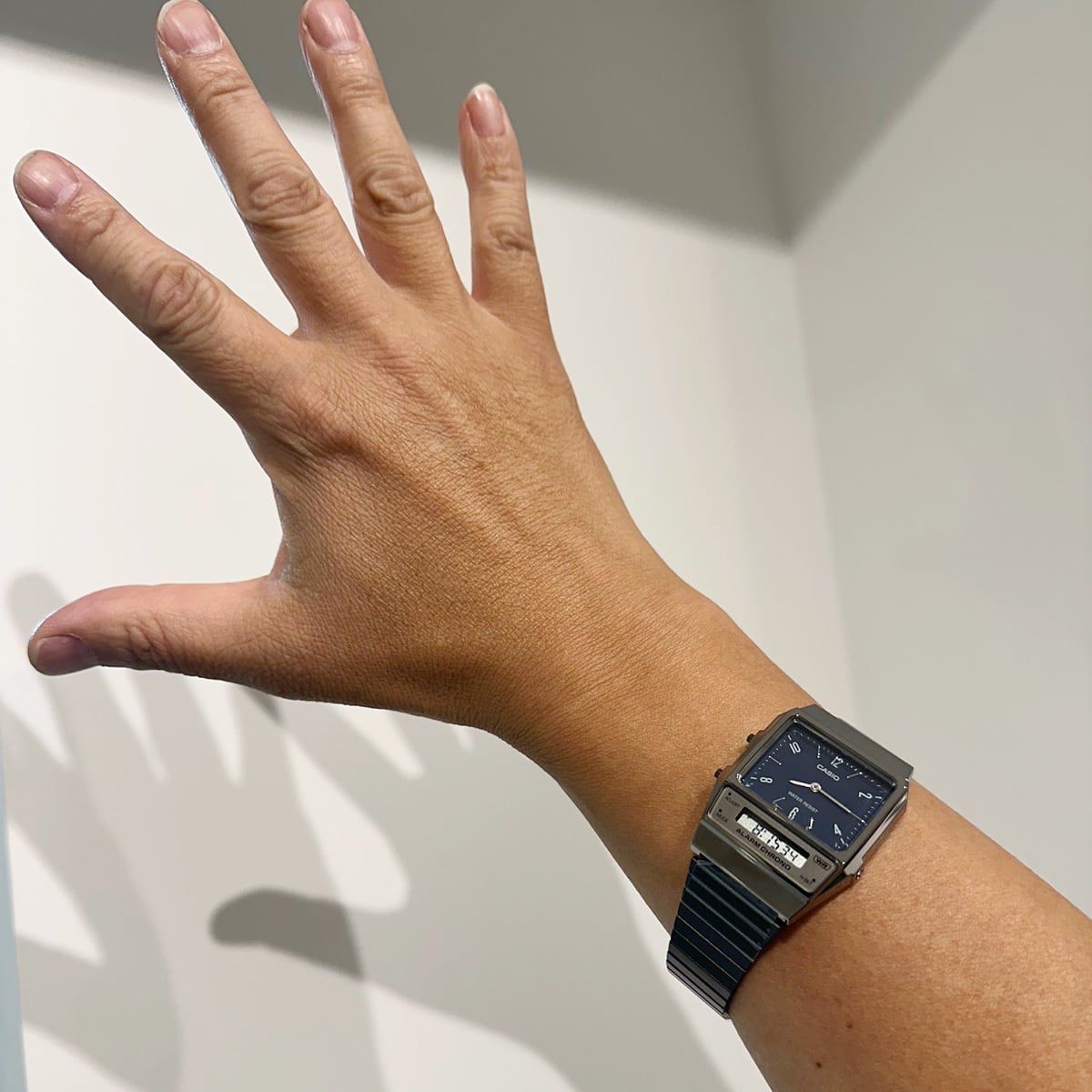 AQ800系の後発のアラビアインデックスの文字盤ですが、このネイビーだけちょっと異端児な感じ。ステンレスバンドもグレーIP加工を施してありクールで大人なたたずまいです。