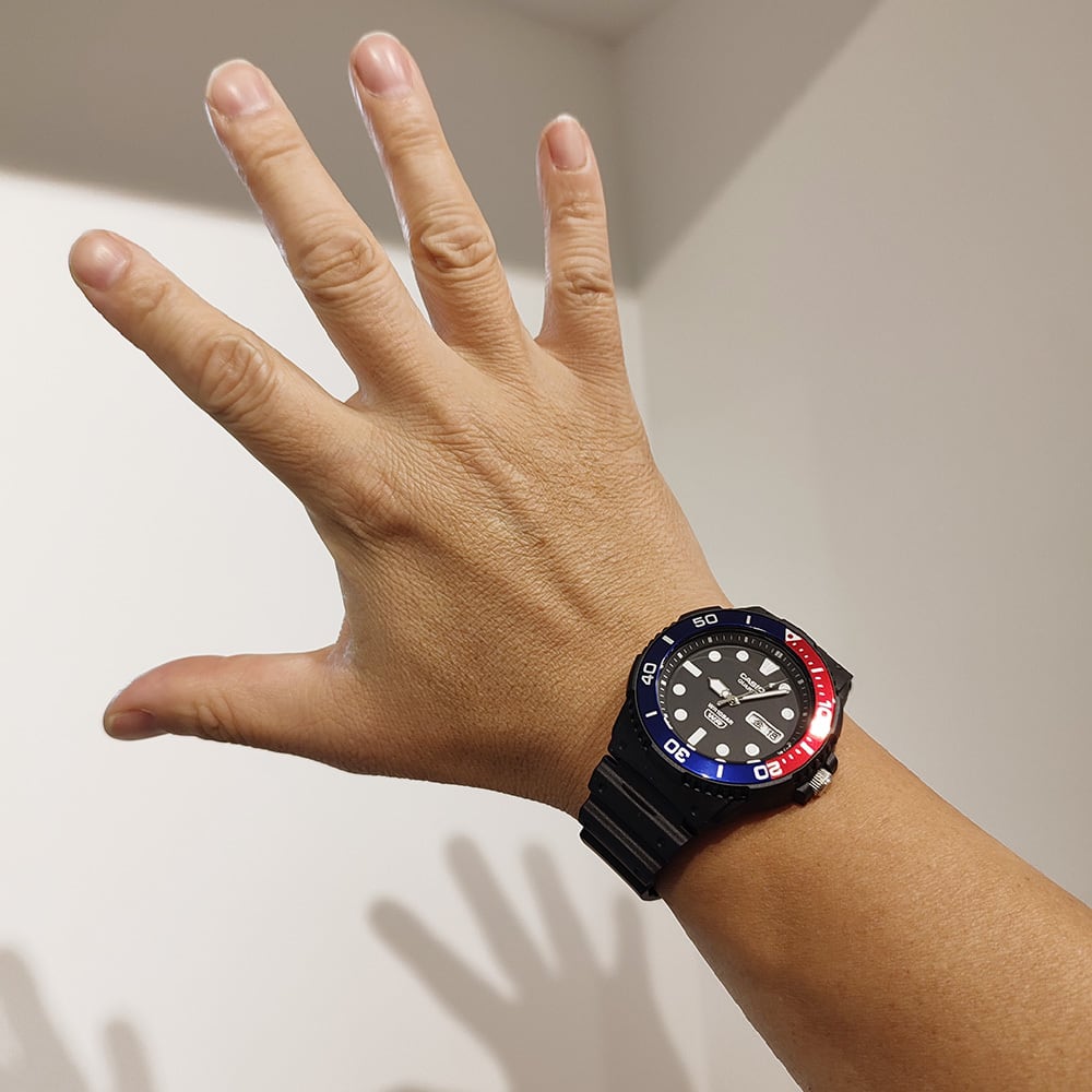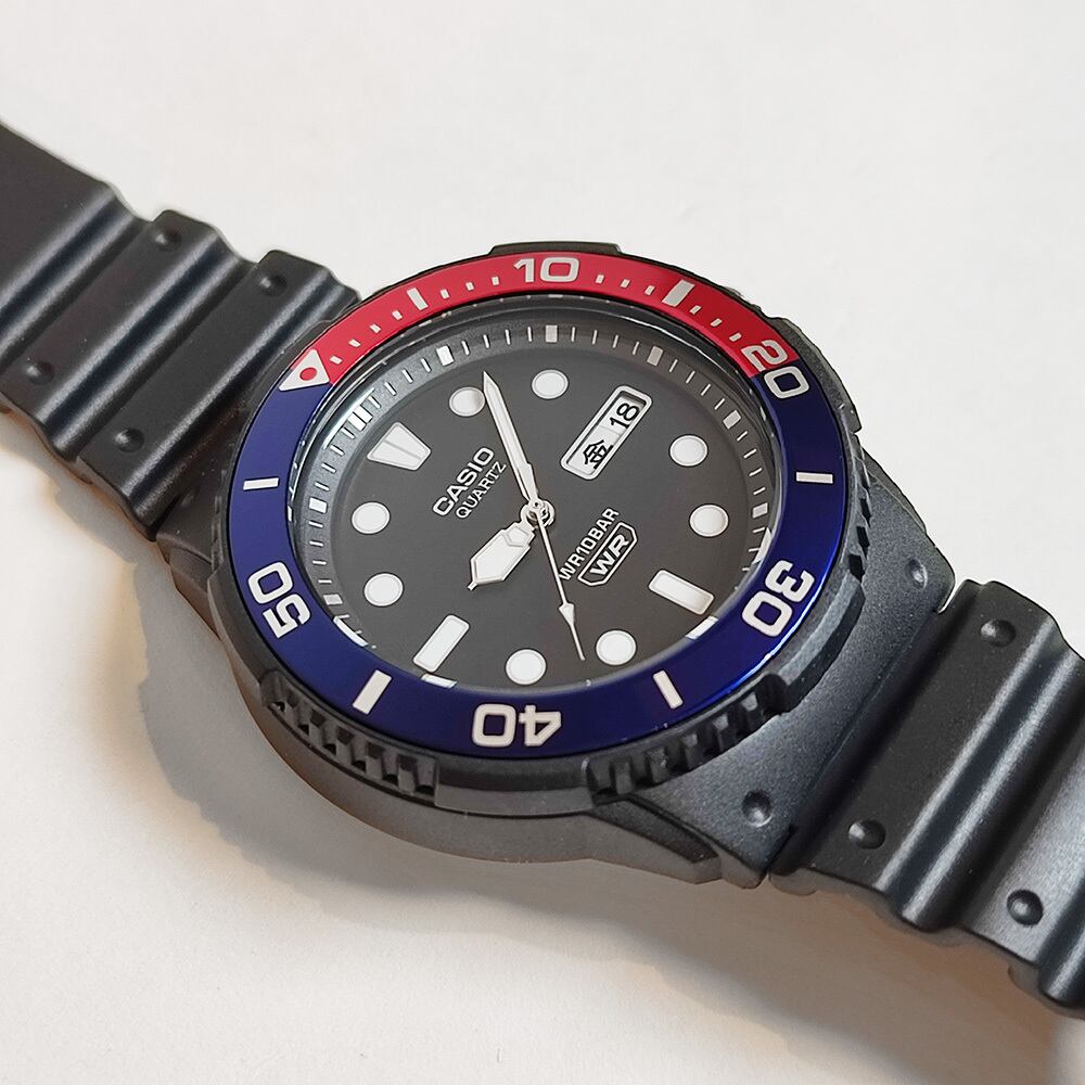 この手のダイバー顔はやはりファッションには欠かせませんよね、信頼あるCASIOブランドのダイバーズ、安価でコスパも最高、赤青ベゼルは某ブランドのGMTっぽさを楽しめます♪w