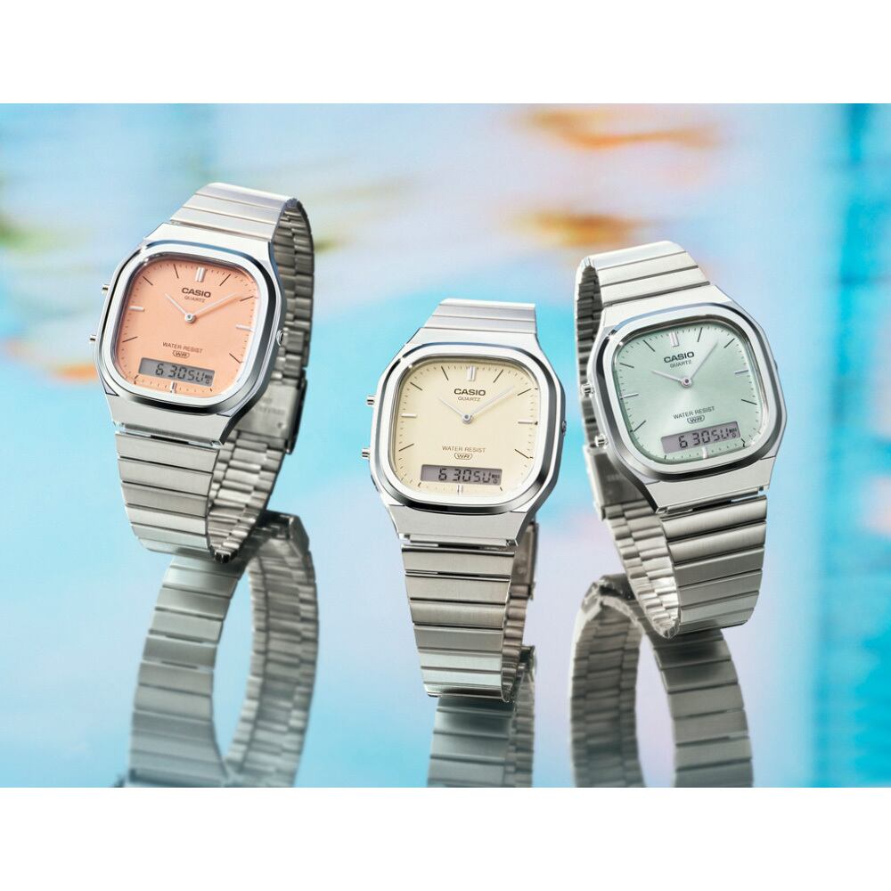 レトロモダンな装いのアナログ・デジタルコンビネーションモデルAQ-240に、ウォームトーンをテーマとしたカラーバリエーションをラインアップ。やわらかな色調で腕元に心地よいニュアンスを添えます。角型フェイスに丸みのあるケース形状を組み合わせたデザインは、曲線の美しさが際立つ洗練の佇まい。ワイドなダイアルスペースを活かし、質感とカラーのバリエーションを展開。シルバーケース×水色の旭光ダイアルは淡いブルーがやわらかくきらめき、清涼感のある腕元に。シルバーケース×ペールトーンのオレンジのマットダイアルは温かみのあるパステルオレンジが、落ち着きと優しさを演出します。シルバーケース×ホワイトのマットダイアルはクリーンな白がミニマルにまとまり、スタイルを選ばず活躍します。好みやシーンに合わせて選べるよう、旭光ダイアルとマットダイアルの双方をご用意しました。穏やかな色味とレトロモダンのデザインが調和し、日常のコーディネートにやわらかな色どりをもたらすAQ-240です。